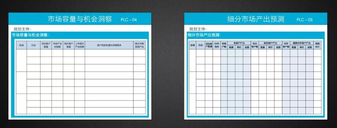 再想想,后来开会连批带奖励,最后调节,让大家接受,所以这个过程不是拍桌子,而是真的以市场为逻辑去分析,所以我给大家看两张表,市场容量分析,那你的区域、行业、目标客户数量、产出规模、上年我的规模,还有客户有没有需求?客户有没有机会?有可能是块盐碱地,客户就没需求变化,这个市场就不做了,因为你有很多市场,很多行业,很多区域的。