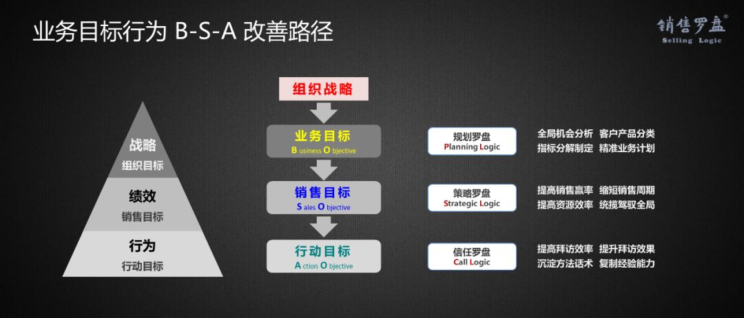 接下来我简单说一下这个怎么改善,其实整个的销售组织团队的改善,比如说我们作为一家公司(刚才说的都是跟客户相关,现在说我们自己团队了),你的业务目标怎么制定?领导给拍的,怎么拍的?每年增长不低于30%。有了新产品战略产品要求占比超过40%都拍下来,能不能完成?拼了命也得完成。机会在哪?自己找去。是不是这个概念?