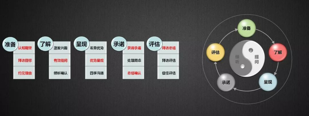 所以基于这个逻辑,我们说拜访客户,我们要做的是什么?准备、了解、呈现、承诺、评估,它是一个闭环。各位,准备,了解,呈现,承诺,评估,你觉得哪块做得最好?谁比谁成功?