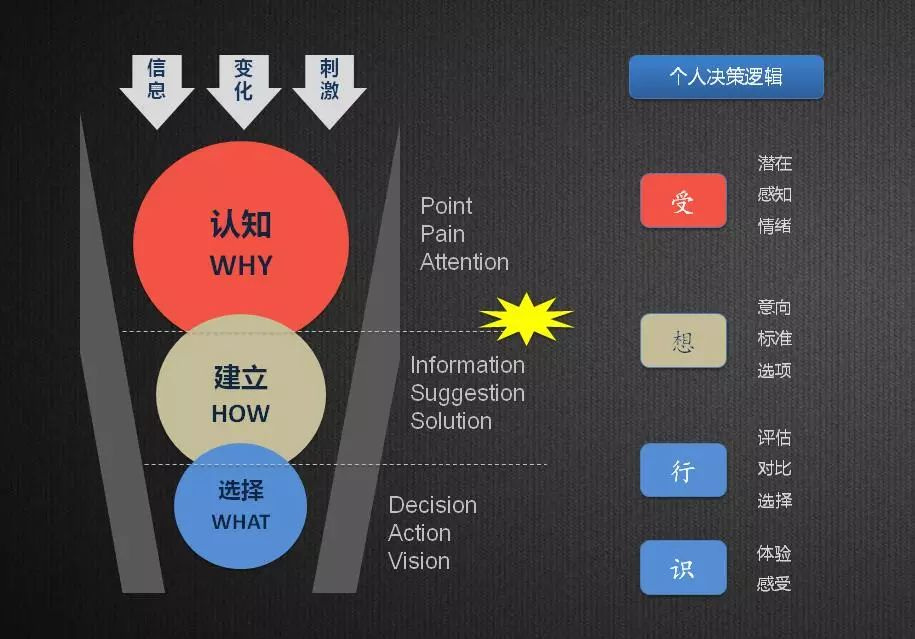 这是人做决策的底层逻辑,叫做信息刺激,然后进行还击,你找到那个point点,然后形成pain的感受,然后引起注意,然后这时候开始接受信息,接受建议,找到方案,然后这个时候然后做决策,然后采取行动,然后实现愿景。