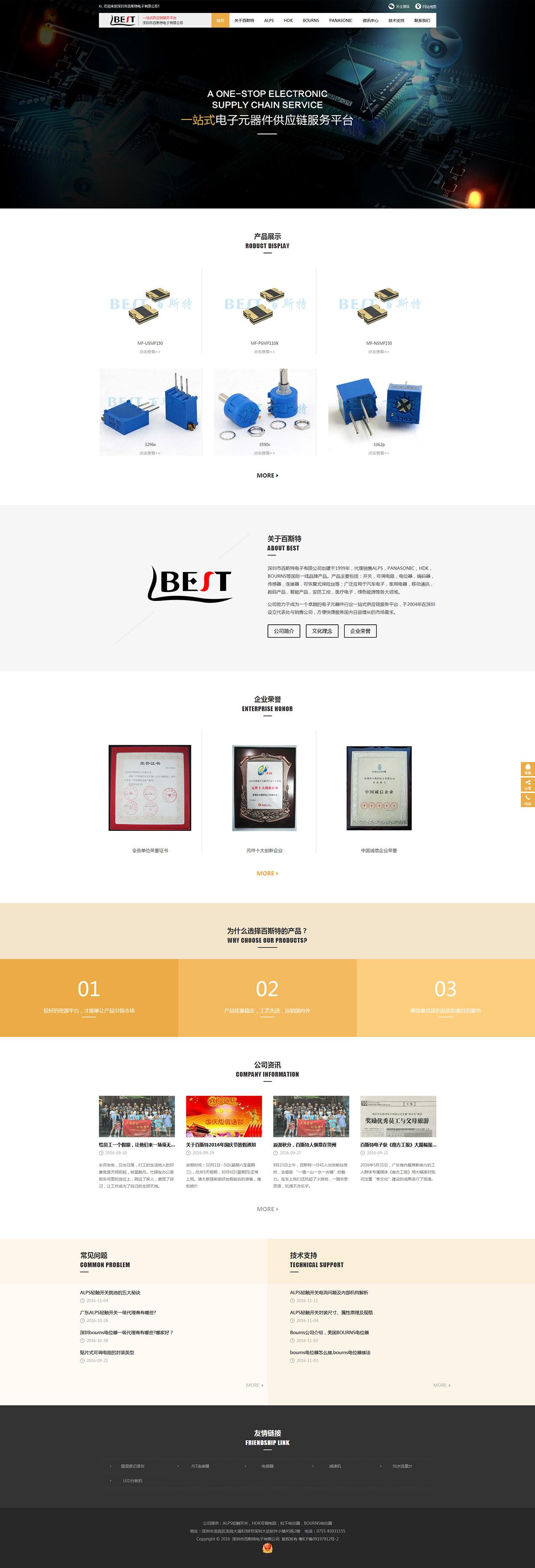 深圳市百斯特电子有限公司创建于1999年,代理销售日本HDK、 ALPS、PANASONIC、NOBLE、TOCOS, OMRON、美国BOURNS、韩国SEHWA等国际一线品牌产品。 产品主要包括:开关、可调电阻、电位器、编码器、传感器、连接器、PTC(可恢复保险丝)、GDT(气体放电管)、 大功率电流电阻Current Resistor(采样电阻)等。广泛应用于汽车电子、家用电器、移动通讯、数码产品、智能产品、安防工控、医疗器械、绿色能源等各大领域。 公司致力于成为一个卓越的电子元器件行业一站式供应链服务平台,于2004年在深圳设立销售公司,方便快捷服务国内日益增长的市场需求。 多种高端一线品牌代理,专业销售团队服务,庞大现货储存能力,原厂直接技术支持,高品质的产品与优质服务,快捷的运输方式,灵活的供货周期,使“百斯特电子”获得了多家合作厂商的肯定。 公司坚持:“以人为本,务实高效,团结进取!”的经营理念,通过:“以市场为导向,以创新为核心,以品质为基石!”的经营方针,不断提升竞争力,最终实现与客户共赢!