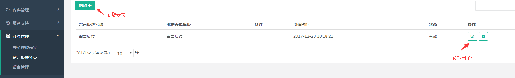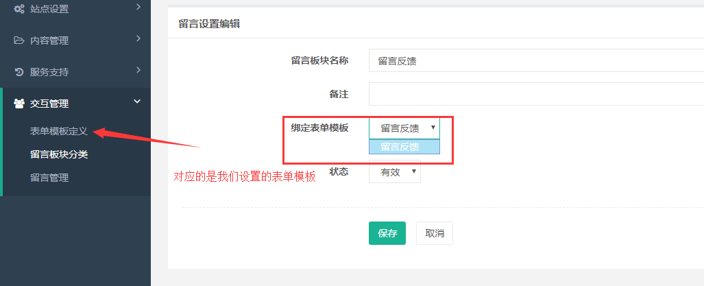 当我们这设置好表单模板后,要到要到留言板块分类给他进行分类,