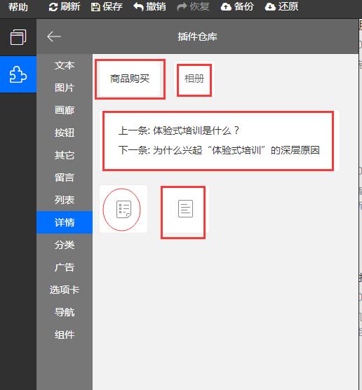 这是我们详情页的插件,里面分了有多种,用框框选中的是用在我们所属功能中的详情页的插件,二用圆圈选中的是所属功能为单页的单页插件。